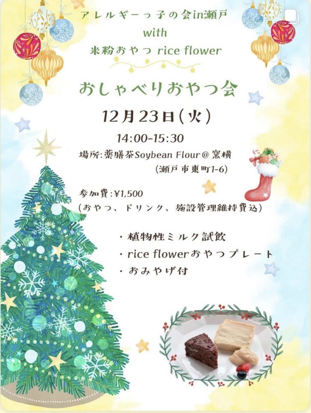 | 瀬戸市 | アレルギーっ子の会in瀬戸 | 4/19(土)10:00-12:00 6/28(土)10:00-11:30 7/27(日)16:00-19:00 8/22(金)10:00-12:00 親子クッキング教室「米粉チョコパン」 9/7(日)14:00-15:30「遊んで!学んで!食べてみよう!「いつもの"くらし~”もしも”にそなえる」 11/29(土)10:00-11:30「ワクワクするけど、少しドキドキな 野外活動&宿泊学習。」 12/23(火)14:00-15:30「おしゃべりおやつ会」 1/31(土)10:00-11:30「防災非常食の試食&おしゃべり会」 | 4/19せとっ子ファミリー交流館 2階集会室 6/28せとっ子ファミリー交流館 2階学習室 7/27(有)創美 ショールーム 8/22やすらぎ会館5階栄養実習室 9/7せとっ子ファミリー交流館 2階集会室 11/29せとっ子ファミリー交流館 2階学習室 12/13薬膳茶Soybean Flour@窯横 1/31せとっ子ファミリー交流館 2階学習室・調理室 | 12/23チラシ 1/31チラシ |